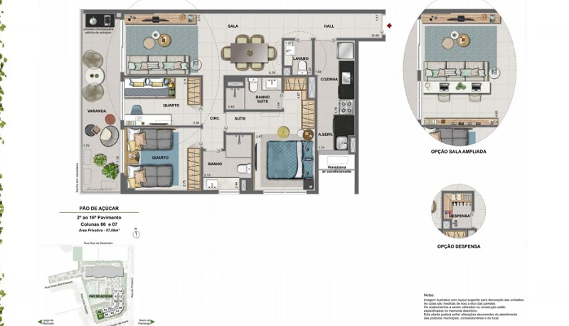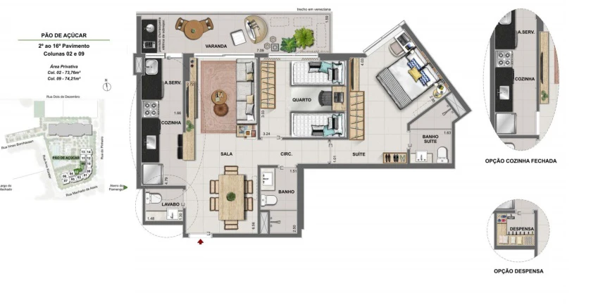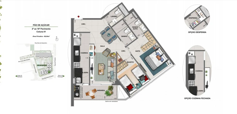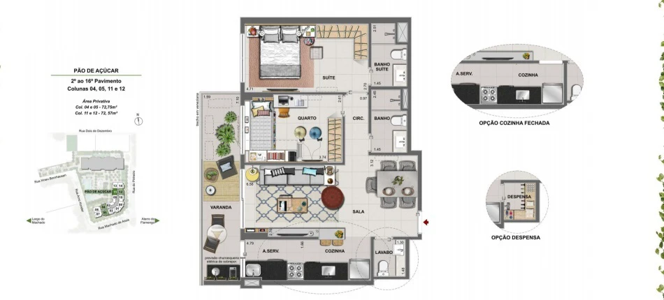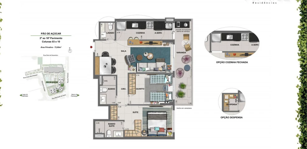 quartos com opção de cozinha fechada ou cozinha gourmet;